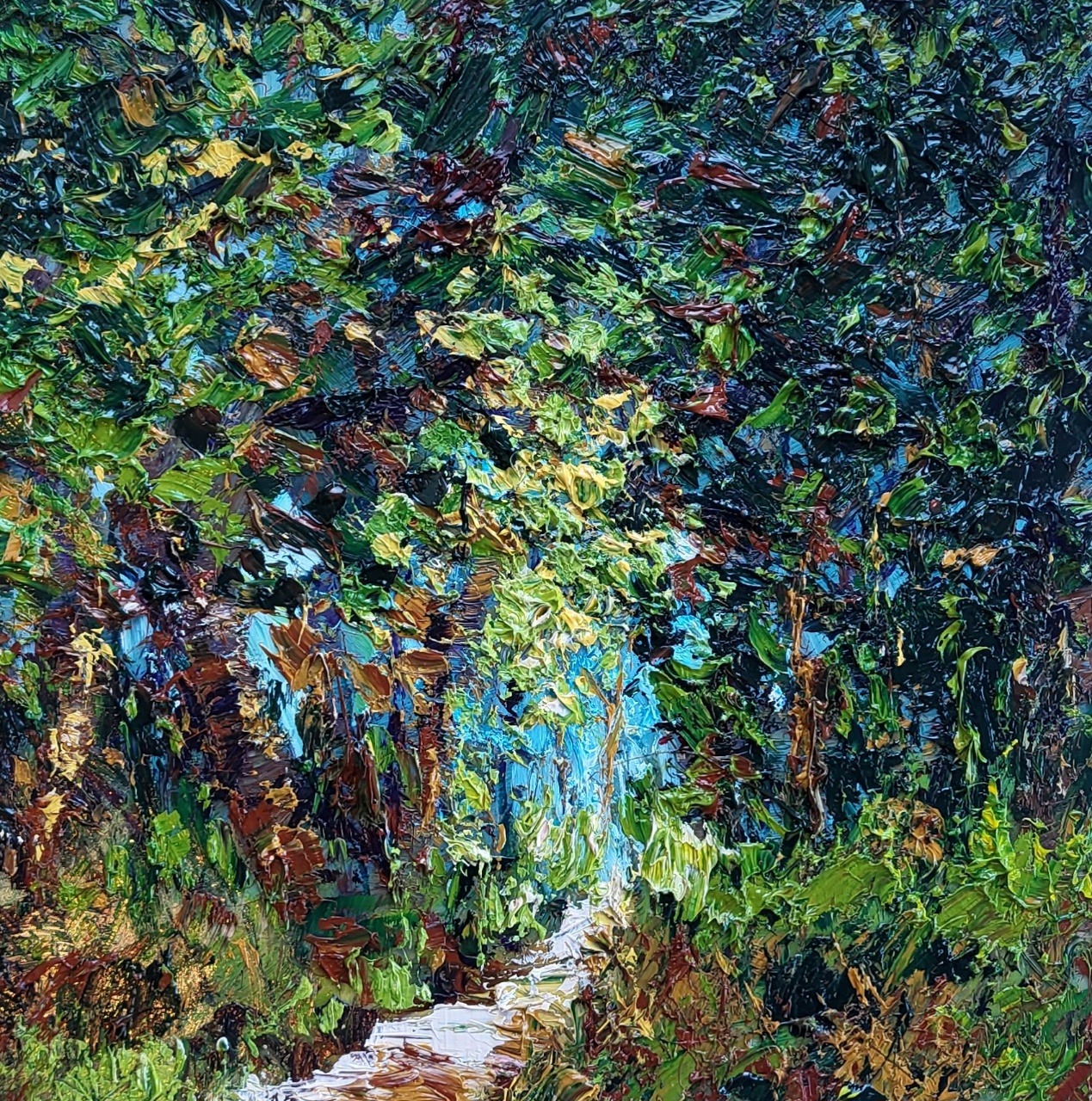 This is painting is of a summer sunrise in the trees of Courttown woods in County Wexford